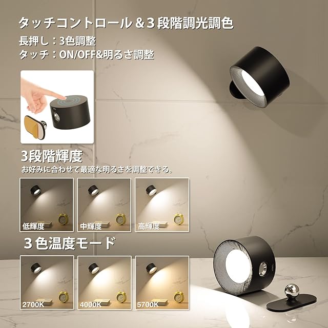【タッチコント・コードレス】タッチセンサーを採用し、簡単にタッチするだけで、電源オン/オフ、色温度、明るさをコントロールできます。コードレスタイプを採用し、大容量充電式バッテリーに内蔵されて、USBで充電すれば電源が無くても使用可能です。災害時には、懐中電灯の代わりに、停電や防災に緊急対応用具としても使えます。ギフトとしても最適です。最低輝度は完全に充電された状態で最大18時間使用できます。最高輝度で完全に充電される場合に5時間使用できます。35000時間以上超長寿命お持ち、節電・省エネ効果があるLEDブラケットライトです。