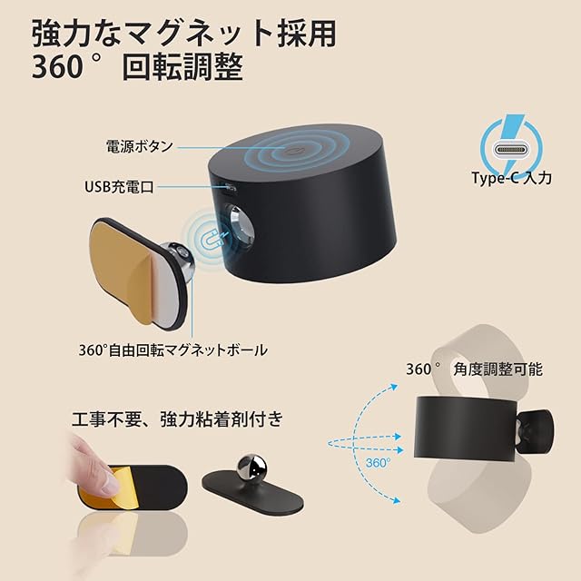【360°回転調整・工事不要】特許取得のマグネットヘッドを採用し、360°までご自由に回転させることができます。全方位でお好みの光を提供します。またベースに強力粘着剤を採用し、工事の必要がなく、壁を傷をつけません。1秒だけで、ランプヘッドを取り外すこととインストールすることができます。