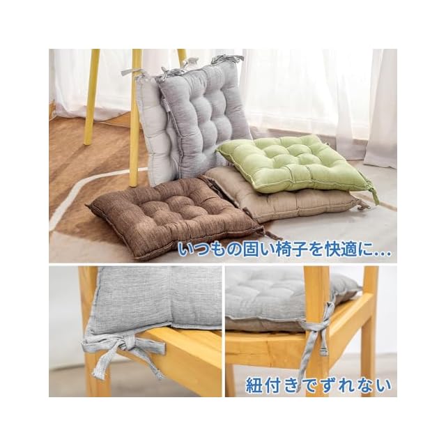 【紐付きでずれない】紐付きのシートクッションで、お家のダイニングチェアや、職場のPCチェアなどを使いやすく!動かすことの多いダイニングの椅子でも、紐付きだから、固定出来て、ズレません。