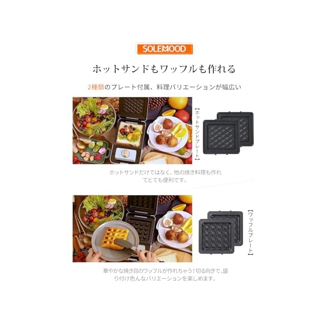 商品名:ホットサンドメーカー SOLEMOOD ワッフルメーカー 耳まで焼ける ホットサンドメーカー 電気 ワッフルメーカー 電気 圧着式 上下両面焼き ホットサンドメーカー大きめ 耳まで焼ける 4つのプレートが付属 わっふるめーかー 焼きグリルとして 朝食とランチ用に 家庭主婦/一人暮らしの方 簡単にお手入れ (クリームホワイト)
