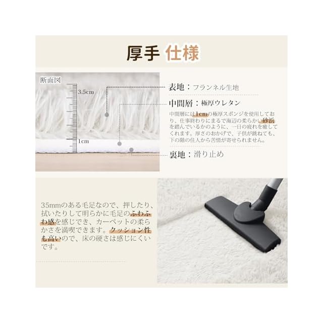 【厚手仕様カーペット】サイズ:120×160cm 一畳 表地:ポリエステル100% 35mm 中間層:ウレタンフォーム約10mm 裏面:不織布(滑り止め加工)約2mm 重量:約1.4kg