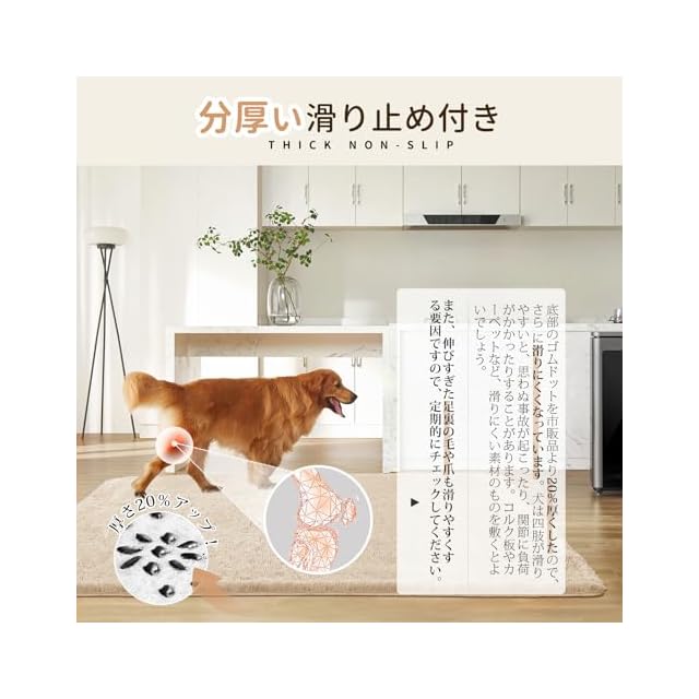 【滑り止め20%アップラグ】お子様や高齢者、ペットのいるご家庭の安全を確保するために、特別にゴムドットの厚みを強化しました。これにより、高齢者がカーペットの上を歩く際に滑る心配をせずに安心して歩けるようになり、お子様が遊ぶ際もより安全に走り回ることができます。また、犬が膝蓋骨脱臼を起こして動物病院に行く回数も減らすことができます。