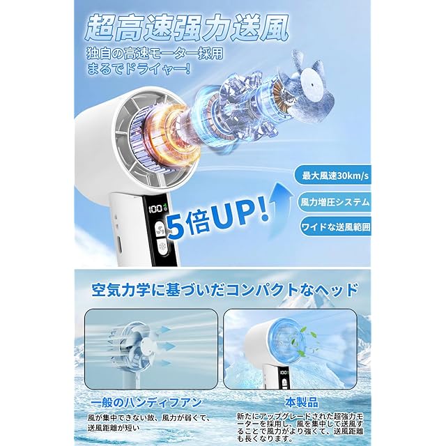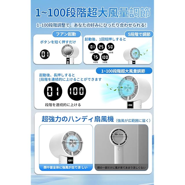 【100段階超大風量調節&爆発する強風!】手持ち扇風機、最先端の高速ドローンモーターと航空グレードのターボファンを組み合わせ、風速、 静音、耐久性が大幅に向上します。 最大風速は9m/sに達することもあります。 1-100段階風量調節により、自然に近い優しい風からパワフルな超強風まで細かく切り替えることが可能、最高回転速度は通常の個人用扇風機の10倍で。小型化しても風量の強力さには妥協していません。信じられないほどの冷却体験をもたらし。
