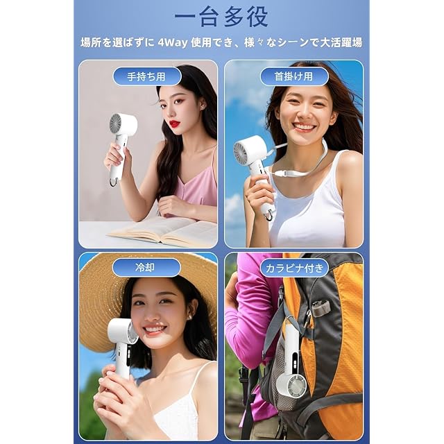 ✨【手持ち/首掛け/卓上4in1携帯扇風機登場】この一台の小型扇風機は、手持ち・首掛け・卓上・クーラー機能の4タイプ機能を同時に備え。お好みに応じてご使用できます。首掛け扇風機 として、じんわりと心地よい風を感じる。卓上扇風機として、オフィスや自宅で爽やかな風に包まれることができます。手持ち扇風機として、自分のペースで風を楽しむ。さらに、カラビナ付きでバッグやリュックに簡単に掛けることができるため、外出先でも持ち運びやすく、使い勝手が抜群です。