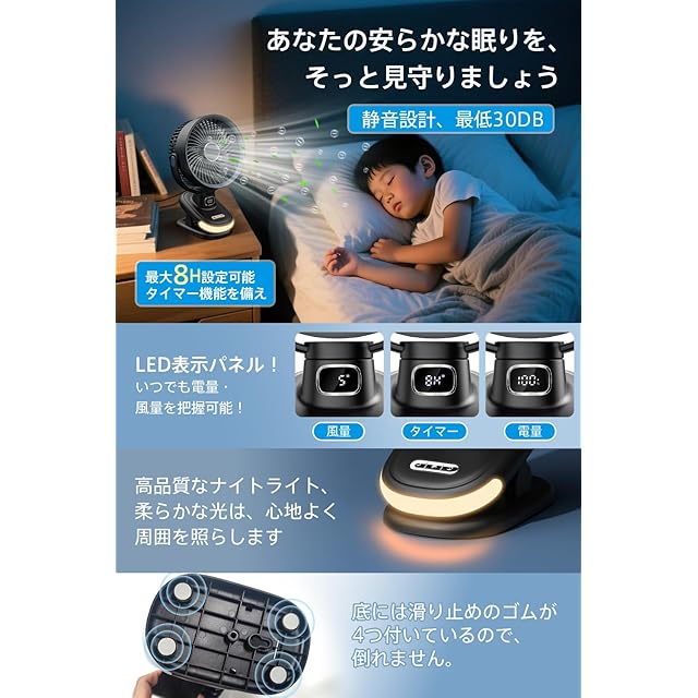 【3D首振り機能+タイマー+ナイトライトで、快適性と利便性を両立!】● 広範囲に涼しい風を届ける「3D首振り機能」左右70°の自動首振り(ON/OFF可能)で、部屋全体に風を行き渡らせます。手動で上下±90°調節可能:デスクワーク時は上向き、就寝時は下向きなど、自由に角度調整。● タイマー機能(2時間/4時間/8時間)で節電&安心就寝時や外出時に自動オフ設定可能。2時間タイマー:昼寝や短時間のリラックスに最適。4時間タイマー:夜間の睡眠時にも安心。8時間タイマー:長時間の使用でも電力消費を抑えます。● ナイトライト機能(独立操作)で、夜間も便利に使用電源ボタンをダブルクリックでON/OFF切り替え。優しいLED照明:寝室や子供部屋の常夜灯としても活用可能。
