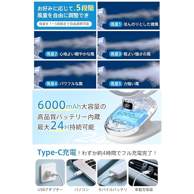 【大容量バッテリー搭載で、最大24時間連続使用可能!Type-C充電で環境にも優しい】1回の充電で最長24時間駆動(風量1使用時)。風量5でも約6時間連続使用可能。 USB Type-C充電対応:最新の充電規格で、高速充電&逆向き挿し防止。充電方法:パソコン(USBポート)モバイルバッテリー家庭用ACアダプター(別売)環境に優しい充電式設計:乾電池や充電池が不要で、ゴミを削減。省エネモード搭載で、さらに長時間使用可能!低消費電力設計により、バッテリー効率を最大化。充電頻度を減らし、コスト削減にも貢献。