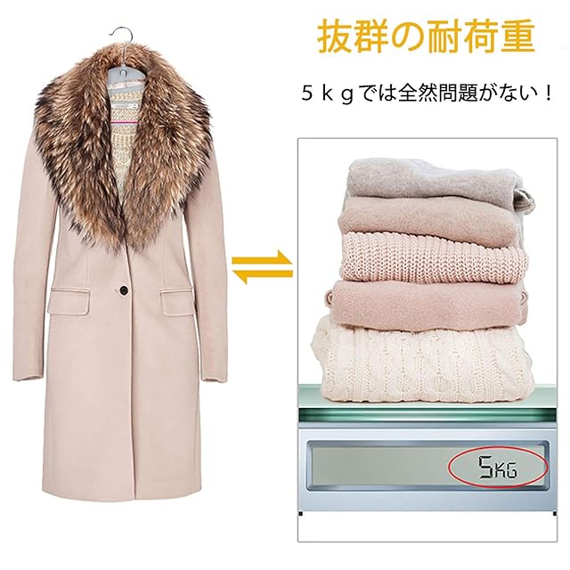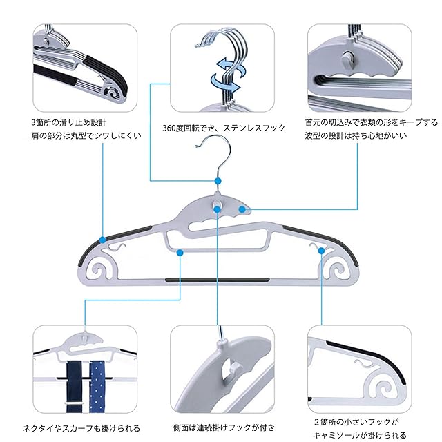 【デザイン】人間工学設計なので、掛け服をシワにくいです。S型の首元の切込みのデザインで、襟ぐりを保護して変形しにくく、服が便利に掛けられます。Tシャツ、セーター、コート、スカート、洋服はもちろん、ズボン、タオル、マフラーでも大丈夫です。ハンガーの下に小さいフックが、キャミソールも掛けられます。