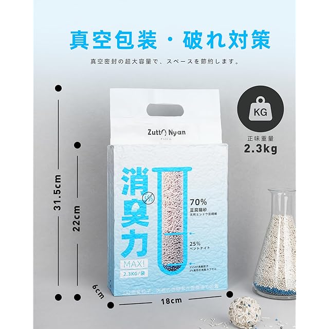 本製品はMix猫砂パイオニアを目指して、消臭抗菌・瞬間吸水・トイレに流せることに優秀な成績をとりました。同時に、大きさの異なる猫砂を配合することで隙間がなくなり、水分の吸収率が向上させます。※専門的な猫砂の配合比率研究を重ねた上で、脱臭を効果に向上させると同時に、粉塵飛散の問題を大幅に軽減することができました。おからとベントナイトの配合比率及び粒径に対し、排泄物を包み込む際に粒子が均一に分布し密着被覆を実現する構造を設計されておりました。そして、真空密封の超大容量で、スペースを節約します。