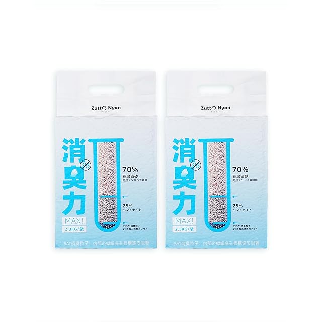 商品名:Zutto Nyan 猫砂 おからミックス 【消臭力MAX!アップグレード】 瞬間吸水 トイレに流せる 固まる猫砂 飛び散り防止 真空包装・破れ対策 ニオイを取る砂 おからとベントナイト (2.3kg×2袋)