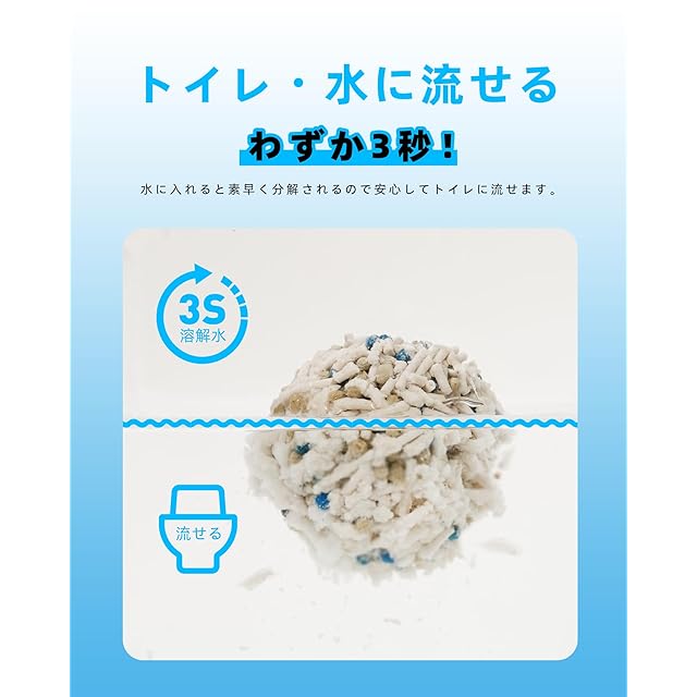 【3秒速溶分解×排水管詰まりにくい】水と接触すると3秒で崩壊する生分解性おから素材を採用!従来品より分解速度40%UPで排水管トラブルリスクを低減することが可能です。※ 水に溶けても、一度に大量の猫砂を流すと詰まりの原因になるので、少量ずつ数回に分けて流してください。