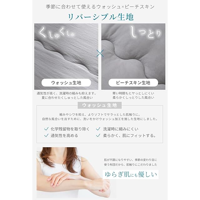 【柔らかな肌触り】ピーチスキン加工を表生地に施し、柔らかく滑らかな肌触りに。ほこりが出にくい、綿切れしにくい、中空ポリエステル綿を使用。