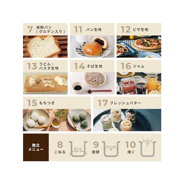 1.食パン/2.早焼きパン/3.ソフトパン/4.フランスパン風/5.スウィートパン/6.全粒粉パン/7.米粉パン(グルテン入り)/8.こねる/9.発酵/10.焼く/11.パン生地/12.ピザ生地/13.うどん・パスタ生地/14.そば生地/15.もちつき/16.ジャム/17.フレッシュバター
