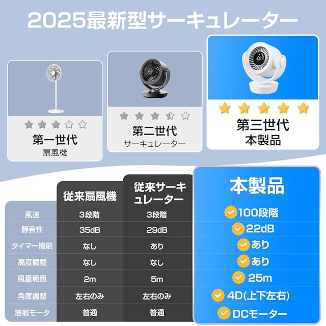 2025年最新モデルの卓上扇風機 サーキュレーター が登場!【3D立体ランダム送風 × DCモーター × 極 静音 設計】を採用し、どの角度からも快適な風を届けます。上下左右 自動首振り 機能により、部屋全体にまんべんなく大風量を循環。最大100段階調節と10Hタイマー、自動消灯機能付きで、就寝時も安心して使える扇風機です。 コードレス設計で、最大27時間の連続使用が可能。Type-C急速充電に対応し、充電もスピーディー。節電にも優れたdcモーター仕様で、環境にもお財布にもやさしい設計。洗えるファンガードでお手入れも簡単。タッチパネル&リモコン操作対応で、ベッドやデスク、キッチンなどあらゆる場所で快適に使えます。寝室や部屋干し、梅雨の除湿対策、掃除中の送風まで、さまざまなシーンで活躍する パワフル送風機 リビング扇風機 静音サーキュレーターです。
