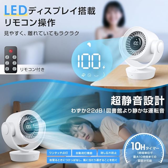 【タイマー機能付き|自動消灯&ワンタッチ起動】省エネ 静音 の 扇風機 モデル で最大10時間のオフタイマー搭載し、コードレス扇風機 として睡眠時も安心して使えます。睡眠中も安心して使用できるLED自動消灯機能と、操作が簡単なワンタッチ起動機能を備えています。さらに、一つのボタンで簡単に画面を唤醒できる機能を搭載で、使いやすさを追求しました。 小型 静音 扇風機 で持ち運びやすく、寝室やオフィスなどさまざまな場所で快適な風を提供します。 サーキュレーター としても活躍する静音モデルです。