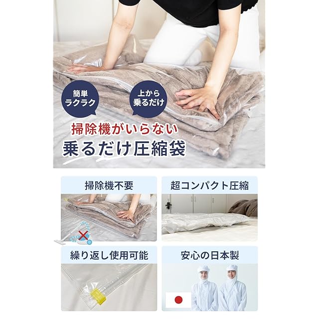 【掃除機不要!乗るだけでラクラク圧縮】 布団や衣類の収納に面倒な作業はもう不要。掃除機なしで、袋の上に乗るだけでしっかり空気を抜いて圧縮完了。誰でも簡単に使える、時短&ストレスフリーな圧縮袋です。