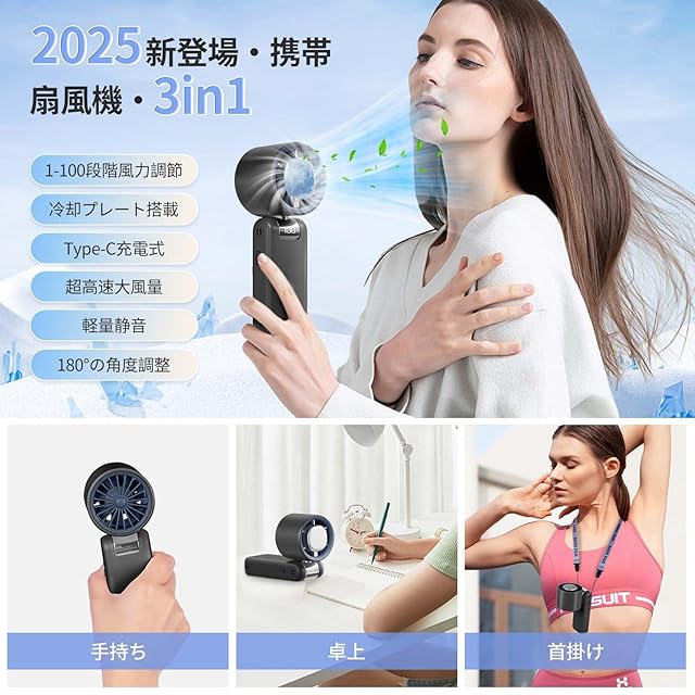 Onetobye【2025新登場・携帯扇風機・3in1】ハンディファン 手持ち扇風機 1-100段階風力調節 瞬時冷感 冷却プレート搭載 卓上 首掛け ポータブルファン 3WAY 超高速大風量 折り畳み 軽量 小型 強力 静音 Type-C充電式 6000mAh LEDディスプレイ表示 長時間使用可能 ストラップ付き 熱中症対策 ギフト