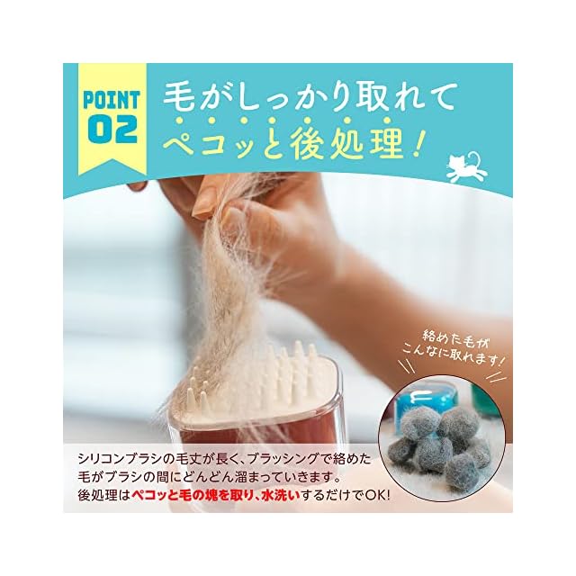 【猫ちゃん夢見ごこち♪うっとりする気持ちよさ】<br>猫ちゃんが気持ちいと感じる硬さ長さを計算し、きちんとブラッシングできる多突シリコン形状にしました。柔らかいシリコン毛で猫ちゃんを夢見ごこちへと誘います。<br><br>【毛がしっかり取れてペコっと簡単後処理!】<br>シリコンブラシの毛丈が長く、ブラッシングで絡めた毛がブラシの間にどんどん溜まっていきます。後処理はペコっと毛の塊を取り、水洗いするだけでOK!<br><br>【シャンプーでも大活躍!】<br>肌を清潔に保つペットシャンプーにも使用することができます。日頃使い慣れたものを使用することで猫の恐怖心を和らげることが期待できます。ブラシはいつでも丸洗い可能です。<br><br>【飴細工のような洗練されたデザイン】<br>透明なカバーと色が映えるカラフルなインナーシェルの組み合わせで、まるで飴細工のような魅力的なデザインに仕上げています。<br><br>【RoHS適合品】<br>環境や人の健康を害する悪影響な特定有害物質に対する欧州の規制をクリアしたRoHS適合品の原材料を使用して作られており、猫ちゃんの健康に優しい製品です。