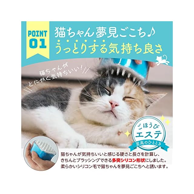 【猫ちゃん夢見ごこち♪うっとりする気持ちよさ】猫ちゃんが気持ちいと感じる硬さ長さを計算し、きちんとブラッシングできる多突シリコン形状にしました。柔らかいシリコン毛で猫ちゃんを夢見ごこちへと誘います。