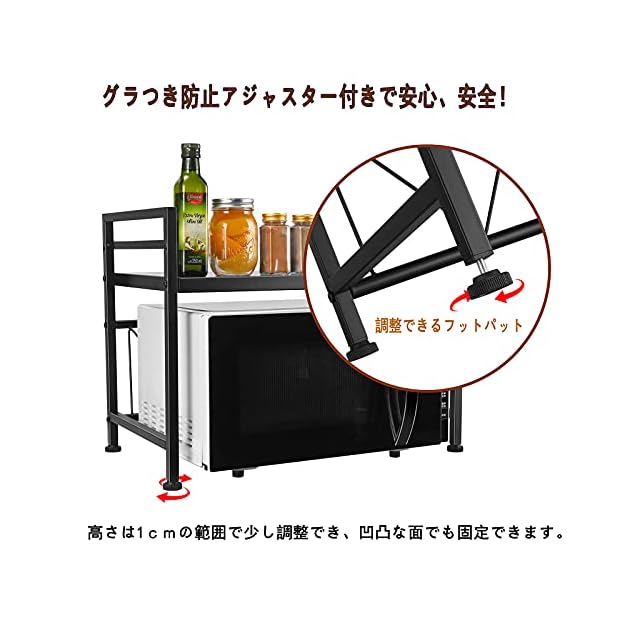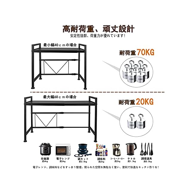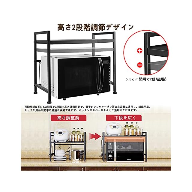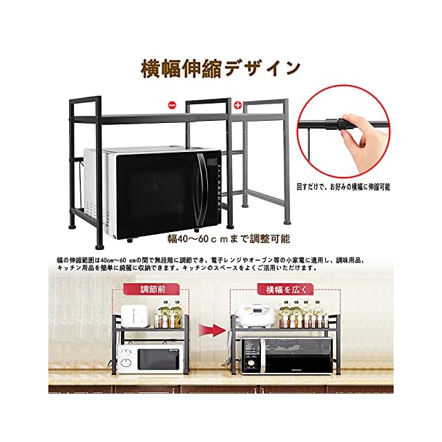 ✅【高さ2段階調節可・幅伸縮式】収納ラックの幅の伸縮範囲は40cm~60 cmの間で無段階に調節でき、可動棚板は約5.5cm間隔で2段階で高さ調節可能で、使い勝手がとても良いです。電子レンジやオーブン等の小家電に適用し、調味用品、キッチン用品を簡単に綺麗に収納できます。キッチンのスペースをよくご活用いただけます。