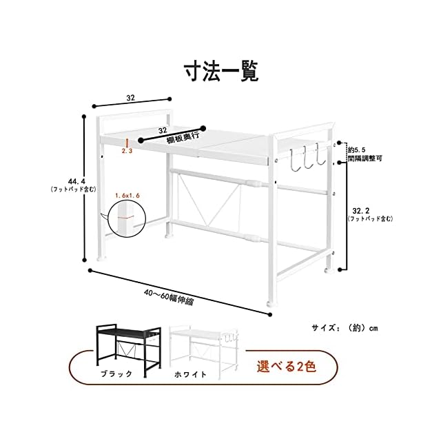 ✅【商品仕様】商品サイズ:(約)高さ44.4cmx奥行32cmx幅40~60cm、組み立て必要、組立時間:(約) 10分。日本語取り付け説明書付き。色はブラック、ホワイトよりお選びいただけます。