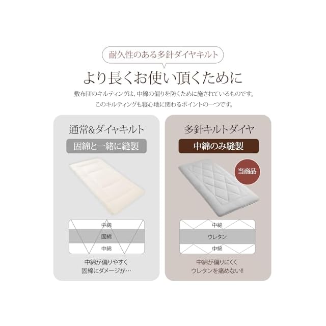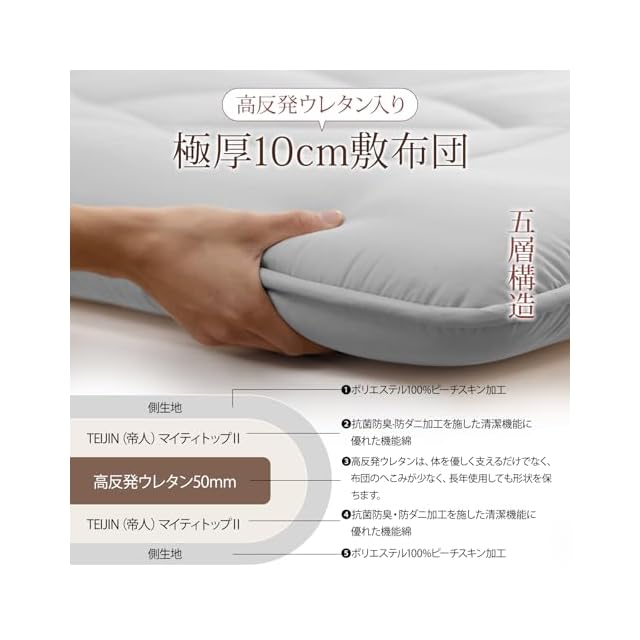 【高反発ウレタン・五層構造敷布団】綿入りのキルト・中綿・ウレタンの五層構造になっているため、しっかり身体を支えるだけでなく、各層の隙間に空気層が出来ることで、通気性にも優れています。厚みは10cmと十分な厚みがあるのに、バランスよく身体を支えてくれるので、ふかふかと柔らかな肌触りを実感できます。