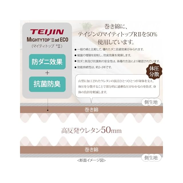 【「マイティートップⅡECO」を使用】中綿には防ダニの高機能素材、帝人のマイティトップⅡを採用しており、お子様がいるご家庭や、アレルギーなどが心配な方におすすめです。防ダニ・抗菌防臭機能があるテイジン「マイティートップⅡECO」が50%使用されています。