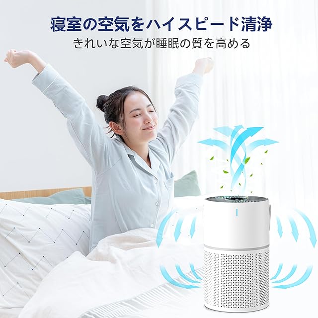 【図書館より静音&自動消灯・光と音のストレスゼロ】独自開発した静音技術と最新のデザインで運転ノイズを最小限にコントロールされました。25dB程度に抑え、図書館よりも静か!おやすみモードで稼働させた場合、3秒間無操作なら、ライトは自動的に消えるので、音や光に非常に敏感な赤ちゃんもペットもぐっすり眠れます。音が静かな空気清浄機なら、日中はもちろん夜間にも安心して運転できます。静音性の高い空気清浄機を求めるのであれば、小型 空気清浄機 おすすめです。また、空気清浄機には、強風量モード・中風量モード・おやすみモードの3段階調節が可能です。空気品質に応じて風速を変更し、省エネにも貢献します。空気清浄機・一人暮らし・1ルームの小スペースはもちろん、職場やリビングのような広い空間でも問題なくご利用いただけます。