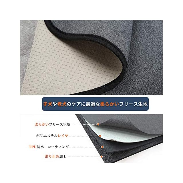 表地は子犬や老犬のケアにも最適な柔らかくて、吸水性の高いフリース生地。真ん中はポリエステルレイヤに防水コーティング。下に浸透する心配はありません。裏面はズレにくいノンスリップ仕上げ。滑りやすいフローリングでの転倒を防止します。ズレが原因の汚れから開放されます