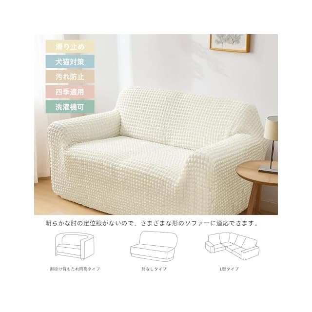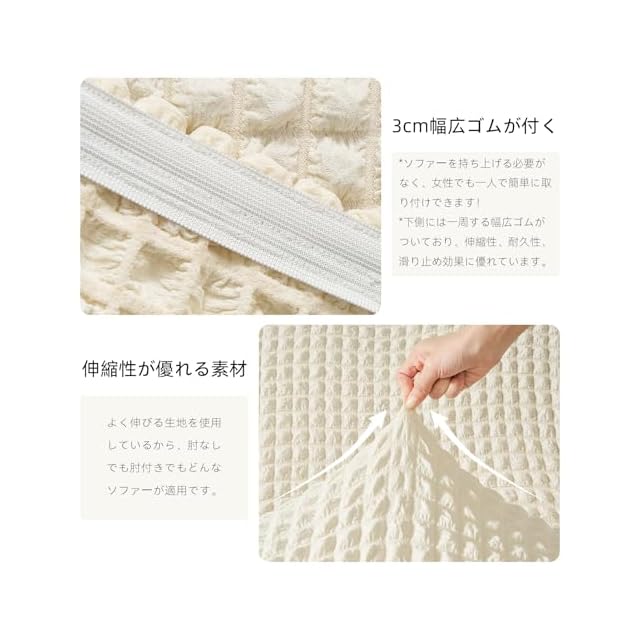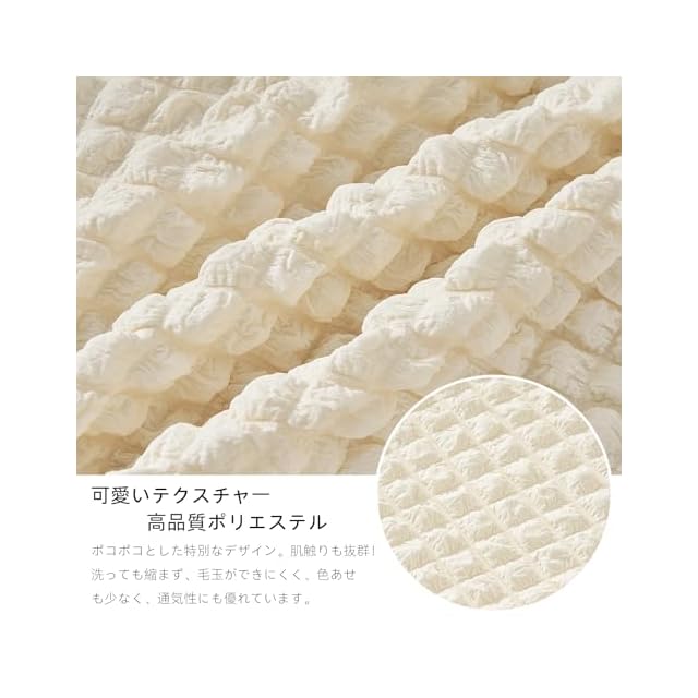 可愛くて高品質なポリエステル素材:ポコポコとした独特なテクスチャーが特徴で、丈夫でありながら柔らかく、肌触りも抜群です。キズや汚れを防ぎ、繰り返し洗っても縮まず、毛玉ができにくく、色あせも少なく、通気性にも優れています。弾力のある素材が様々な形やサイズのソファにしっかりフィットし、かけるだけソファカバー、ズレがない快適にお使いいただけます。長期間使用できる高品質な素材です。