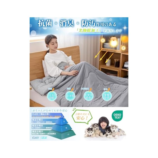 ❄【抗菌防臭、吸湿速乾】CLASS I認証!光触媒加工を採用し、細菌や有害物質を効果的に分解できます。中綿には優れた抗菌防臭効果を持っています。イヤな臭いを防ぎ、毎日スッキリ。吸湿速乾で、サラサラで快適な状態が続きます。ペットやお子様のいるご家庭でも安心してお使いいただけます。