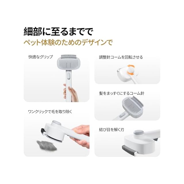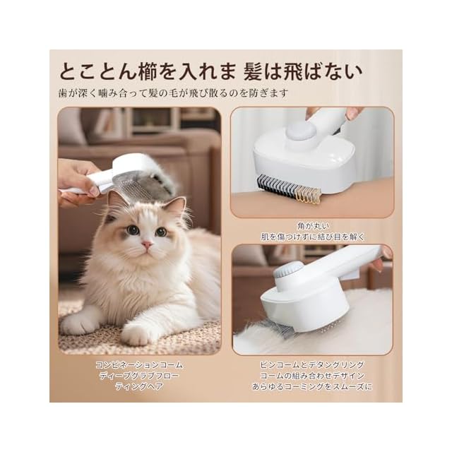 【ヘアスムージング機能】 - ディープケアで柔らかくツヤのある髪に 丸い頭の傷防止コーム歯:鈍い頭のステンレス鋼または柔軟な樹脂の歯が皮膚を傷つけないように使用されており、特に敏感なペット(プードル、ビションフリーゼ、スフィンクス猫など)に適しています。 浮遊毛とフケを除去: きつい櫛の歯が髪の下層の奥深くまで入り込み、死んだ毛やフケを効果的に削り取り、髪が飛び散る状況を軽減します。特に換毛期の犬種(コーギーやゴールデンレトリバーなど)に適しています。