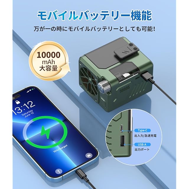 【モバイルバッテリー機能&Type-C急速充電】ただの扇風機ではありません——超大容量モバイルバッテリーとしても使える革命的な2in1デザイン!最新Type-Cと従来のUSB-Aの出力ポートを完備!スマホ/タブレット/イヤホンなど、すべてのデバイスに対応可能!1台で全ての充電ニーズを解決!緊急時も外出先も、これ1台で電力不安ゼロ!付属の高品質ケーブルで、Type-Cポートによって本体への急速充電も可能!急速充電対応だから、短時間でフル充電可能。忙しい現代人のライフスタイルに最適化されています。