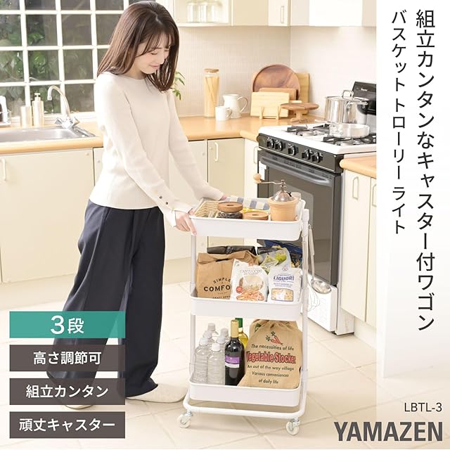 山善(YAMAZEN) キッチンワゴン キャスター付きワゴン 3段 バスケットトローリー メッシュタイプ 高さ調節可能 全体耐荷重30kg 幅45.5×奥行36×高さ81cm ワゴン キャスター付き 収納ワゴン キッチン 収納 組立品 ホワイト LBTL-3(WH) | Trend Design BASE店