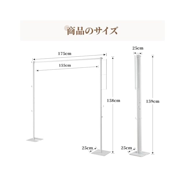 多くの洋服を干せる:使用時約約W175×D25×H160cmで、服20枚以上も干すことができるので、洋服の量が多い日でも安心して使用できます。また、布団を干すにも十分な長さで用途が広いです。内寸:ハンガーパイプ:約W150×H159cm