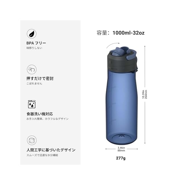 高品質トライタン素材:ボトルは耐久性のある割れにくいトライタン素材で作られており、BPAや有害物質を含まず、安全で健康的な飲み心地を提供します。
