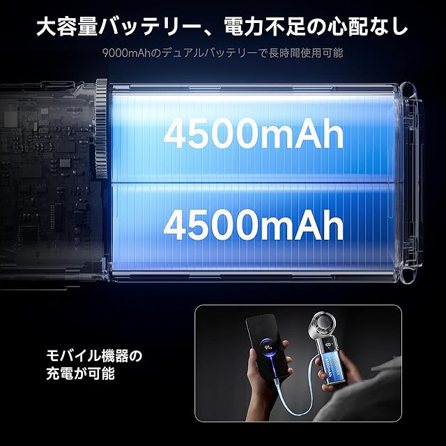 ▶ 【9000mAh 超大容量!モバイル充電対応】 9000mAh 大容量搭載で、充電 1 回で長時間使用可能!さらにモバイルバッテリー機能付きでスマホ充電も OK、外出先でも電池切れ心配なし!