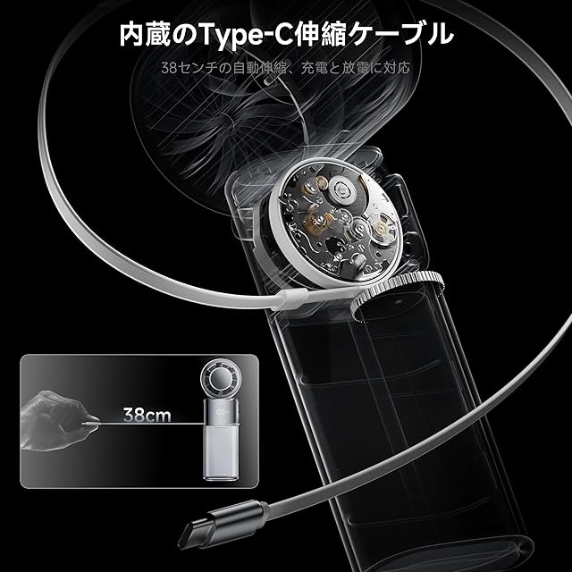 ▶【 内蔵 Type-C 伸縮充電ケーブル】 本体に Type-C 伸縮ケーブル(38cm)を内蔵!充電時もスマホ接続時も、外部ケーブル不要