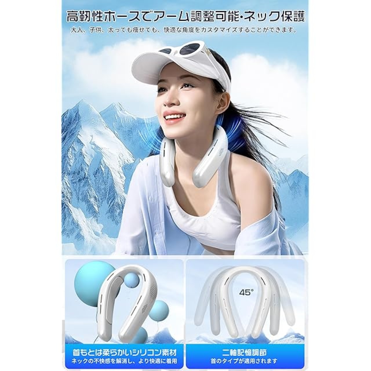 【アーム調整可能&羽根なし安心設計】この冷却ファン首は人間工学に基づいた首の弧のデザイン、中央部分は柔らかいシリコン素材で作られており、首の形状に合わせて調整でき、自然なフィット感を向上させ、小柄な方から大柄な方まで、あらゆる体型に対応します。大人、子供、太っても痩せても、快適な角度をカスタマイズすることができます。長時間の着用でも疲れにくくになります。首掛けクーラーは羽根なしとミニチュア排風口設計で、髪を巻き込まずに、異物を挟み込む事もご心配ありません。指が入る隙間がなく、事故を防ぐことができます。子供・大人にも安心してお使いいただけます。安全で快適な使用が可能、プレゼントに絶対喜ばれる夏ギフト!