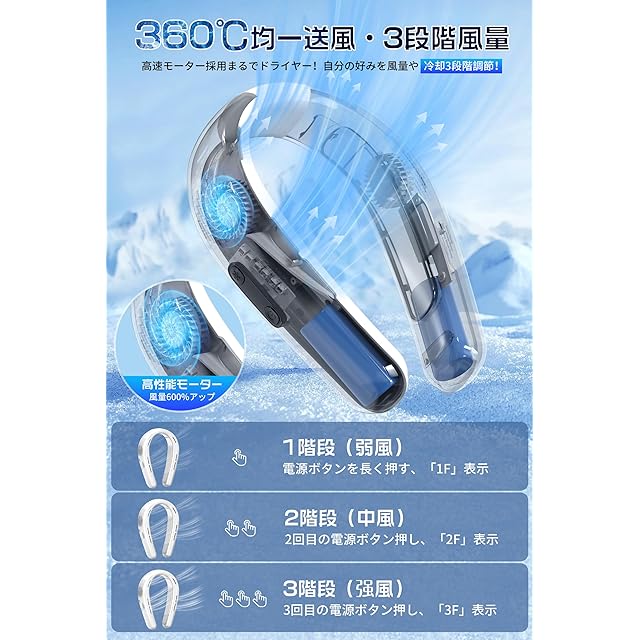 【360°立体冷風&3段階風量調節】この首掛け扇風機は高速モーターを搭載し、1分間に7000回転の高速回転で、風量が80%増加し、熱を瞬時に吹き飛ばします。6つの送風口で、上下左右に強力な冷風が連続的に流れ、首から背中にかけて寒冷空気が360度全体を包み込み、まるで専用の清涼空間が広がっているかのような心地良さを感じることができます。3段階自由調節できます、ボタンを押すと、「風量」は強・中・弱の3段階と「冷却」は弱冷・中冷・強冷の3階段を切り替えることが可能です。この首掛けファンを手に入れば、暑い夏の日々でも、自分だけの快適な涼しい空間を手軽に作り出すことができます。