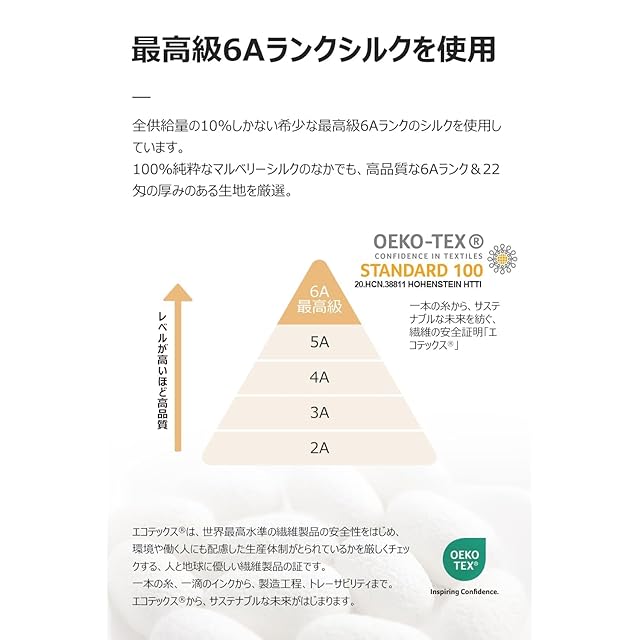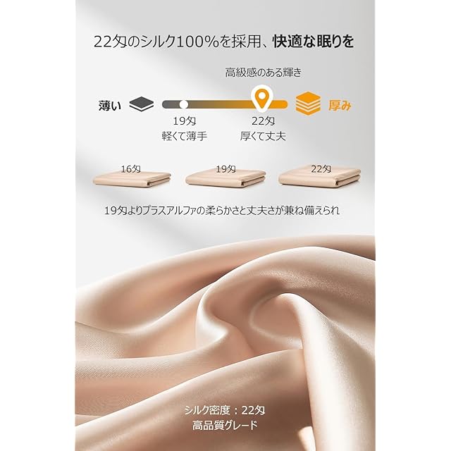 何より贅沢? 1. より丈夫 (約93cm四方の生地の重さ) 1匁≒3.75g 19匁≒71.25g 22匁≒82.5g 重さから見れば、22匁シルクは19匁のより10.25gほど重いです。 ひとつのまゆから、生糸が約 800m ~ 1,200m も採れる、天然繊維の中では唯一の長繊維ですので、より重いシルクは、より長い生糸を持って、より丈夫と思われます。 2. より高い耐久性 繊維が細いためにシルクは摩擦には弱いです。 19匁シルク枕カバーなら、繰り返し着用しているうちに擦れて毛羽立ちができたり、薄くなったりします。 22匁シルク枕カバーと言えば、丈夫で耐久性もより高いです。 品質に絶対な自信を持って、安心してください。 3. より滑らか シルクは人間の皮膚と同じタンパク質(18種類のアミノ酸)から構成されていて、第二の肌と言われており、軽くてなめらかな肌触りがあり、人間の肌ととても相性がいいのです。 抜群の着心地が22匁シルク枕カバーから開始! 4. より眩しい 絹は、生命の源と言われる「アミノ酸」を豊富に含む、天然の蛋白質繊維です。断面は三角型のため、真珠のような素晴らしい光沢が溢れています。 その他の要因もあるため、特定の範囲内で、より高い匁数は、より眩しい光沢があると考えてきます。