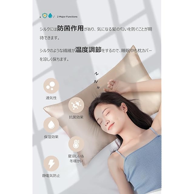【美髪&美肌枕カバー】シルク100%の枕カバーで、シルクに含まれるタンパク質は、枝毛・縮毛・曲がり・乾燥を最小限に抑え、髪と髪の摩擦を平均45%減らす効果があります。また、抗菌作用もあり、気になる髪の匂いを抑えることが可能です。寝ている間に美髪へ導くので、切れ毛や絡まりなどのヘアケアに悩みのある人にはおすすめ。