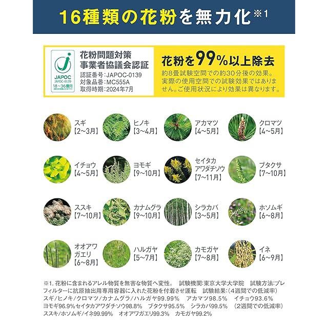 ●TAFUフィルター(静電HEPAフィルター)でしっかり集じん<br> 撥水・撥油効果の高い素材を使用したフィルターを採用。<br> 汚れが広がりにくく、静電力が落ちにくいのが特長です。<br> 0.3μmの微小な粒子を99.97%除去※します。<br> ※フィルターの除去性能です。部屋全体への除去性能とは異なります。JIS B 9908の試験方法に基づき測定<br> ●独自の構造でキレイな空気をつくる<br> 吹き出しの音がポイント!ワイドな吹き出し口の採用と、ファンをフィルターの下部に配置することによる防音効果で、人が感じる運転音に配慮しました。<br> ●ストリーマで本体内部も清潔に<br> 通風経路であるファンスクロールを除菌※<br> ※試験機関:株式会社食環境衛生研究所 試験番号:227116N-1 試験方法:空気清浄機に搭載したファンスクロールに菌液を接種した試験片を貼付し、25m3(約6畳)の密閉した試験空間で運転。5時間後の生菌数を測定。<br> ※試験対象:1種類の細菌 試験結果:5時間後に99%以上抑制 試験機:MC555Aと同等機種(MCK40Z)で実施(ターボ運転)<br> ●電源コードにL字プラグ採用で安心、便利に<br> ●壁掛けにも対応します。壁掛キット【別売】 品番:BKK110A4<br> <br> 【仕様】<br> 適用床面積(目安) :〜25畳 (〜41m2)<br> 空気清浄 清浄時間:8畳/11分<br> 空気清浄モード:しずか・弱・標準・ターボ<br> 電源:単相100V (50Hz・60Hz共通) キャブタイヤコード(床置対応)<br> 定格消費電力:46W<br> 安心便利機能:操作部抗菌(操作シート部分)、L字プラグ電源コード、リモコン付き<br> 外形寸法:幅270×奥行270×高さ500 mm<br> 質量:6.8kg