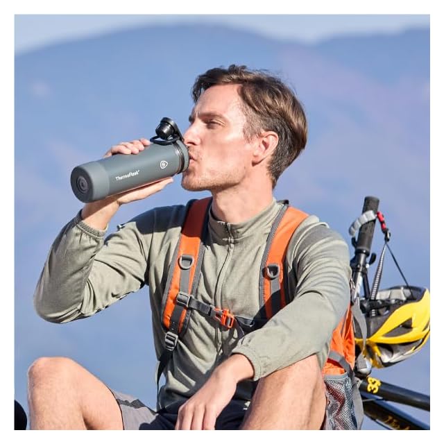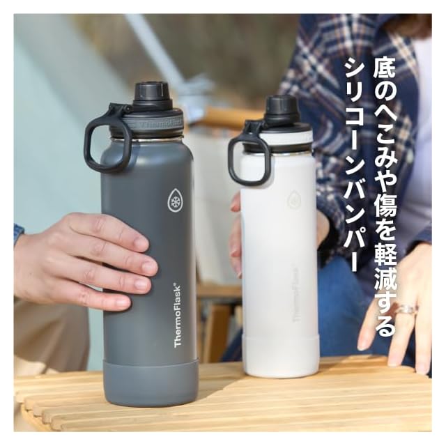 アメリカ カリフォルニア・ハンティントンビーチ生まれのThermoFlaskがリニューアル!スリム&軽量化でさらに快適に! ◆保冷専用直飲みタイプです。 ◆真空断熱ステンレス構造で、保冷力抜群の保冷専用ステンレスボトルです。 ◆底部を衝撃から守るシリコーンバンパーは標準装備でファッショナブルな仕様です。 ◆本体は、濡れていても滑りにくくキズに強い塗装仕様です。 ◆持ち運びに便利なキャリーハンドル仕様です。 ◆飲み口はPETボトルの使用感で開閉できます。 ◆食器洗い乾燥機のご使用はお避けください。 ご使用前には取扱説明書をよくお読みください。 ●容量:1.17L ●商品重量:約456g ●商品サイズ: ハンドルダウン時 幅85mm×奥行90mm×高さ300mm ハンドルアップ時 幅85mm×奥行85mm×高さ340mm ◎本体 ◆アウター:ステンレス鋼 ◆インナー:ステンレス鋼 ◎フタユニット ◆フタ:ポリプロピレン ◆ネジキャップ:ポリプロピレン ◆ハンドル:ポリプロピレン ◆シリコーンリング:シリコーンゴム ◆ネジキャップパッキン:シリコーンゴム ◆フタパッキン:シリコーンゴム ◆軸:ステンレス鋼 ◎バンパー ◆シリコーンバンパー:シリコーンゴム ●原産国:中国