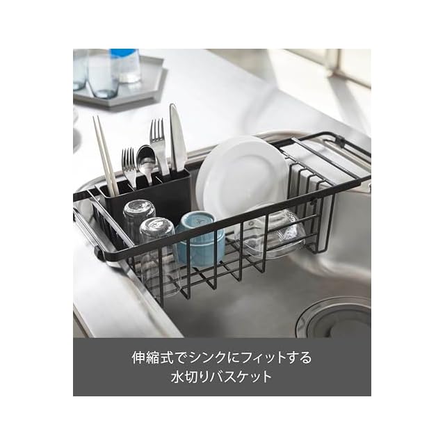 商品名:山崎実業(Yamazaki) 伸縮 水切りワイヤーバスケット ブラック 約W44~54×D19.5×H14cm タワー tower 水切りラック カトラリーポケット付き 3493