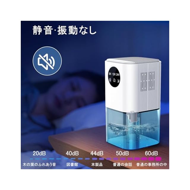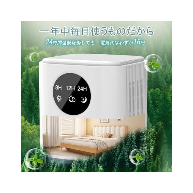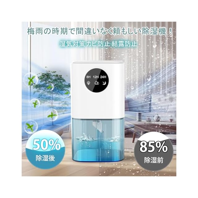 【革新的な半導体技術】電力を利用して熱を移動させる半導体熱電素子「ペルチェ素子」を採用した除湿機。空気を冷却し、結露を引き起こして湿気を取り除く仕組みです。除湿量は1日あたり350mlで、カビの発生を防ぎ、湿気や結露対策に最適。梅雨や夏の湿気対策、冬の結露対策として、年間を通して使用できます。【ご注意】除湿機の定格除湿量は、室温30℃、相対湿度80%の条件下での1日(24時間)の除湿量です。 【1.5L大容量・手間いらず】この小型除湿機は、透明な水タンクを採用しており、タンクの水量を一目で確認できます。1.5Lの大容量分離式水タンクを搭載しており、週に一度の排水でOK。ハンドル付きで、簡単に持ち運べるので、リビングや寝室以外にも、風呂場、洗面所、クローゼット、靴箱などの狭いスペースにぴったりです。 【7色の雰囲気ライト・お休みモード】ライトボタンを押すことで、7色のライトが自動で切り替わるモードや、色を選択できるモードに切り替え可能。また、寝室でも安心して使える「お休みモード」を搭載しており、運転音が静かになり、睡眠の邪魔をしません。 【タイマー設定・自動停止】シンプルなボタン操作とLEDディスプレイで、年配の方でも簡単に操作可能です。タイマー機能を活用すれば、出勤時にセットして帰宅時には除湿が完了。水タンクが満杯になると自動で停止するので、外出中でも水漏れの心配がありません。 【省エネ・電気代が安い】1年中使える省エネ設計で、24時間連続稼働しても電気代はわずか16円!梅雨の時期だけでなく、毎日の使用に最適な頼もしい除湿機です。