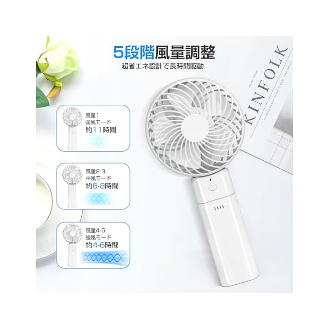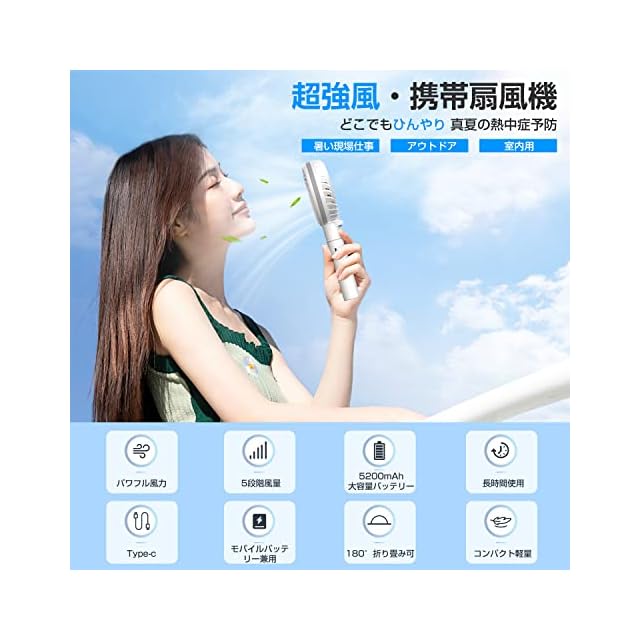 「5段階風量調節可・長時間連続作動」このハンディ扇風機は5段階風速モードがあり、風量切替ボタンを押すたびに、自分に適切な風速モードを選べます。長時間連続運転が可能に。終日のイベントも快適に過ごすことが出来ます。熱中症、発熱、あるいは日焼けしている場合はこの小型扇風機を使いながら体の温度を下げることができます。小さいかつ手持ちと卓上の両用設計で使い方も自由自在、散歩や花火大会、運動会やオフィスなど、様々なシーンで大活躍、夏日のプレゼント用にも最適です。