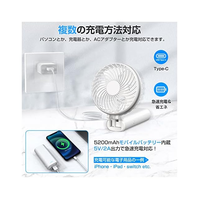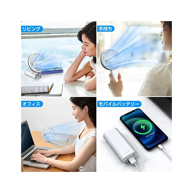 「3wayの小型扇風機として」180°折りたたみ式のデザインな手持ち扇風機で事務所やオタクの机に置いて卓上ファンとなり、小型で手持ちファンとして花火大会や山登りなどのシーンでも対応可、多機能で自由に変身できます。【モバイルバッテリーとして】本体から取り外し、一瞬で5200mAhの小型モバイルバッテリーに変身、スマホなどへの充電にもでき、とても役に立つUSBファンです。
