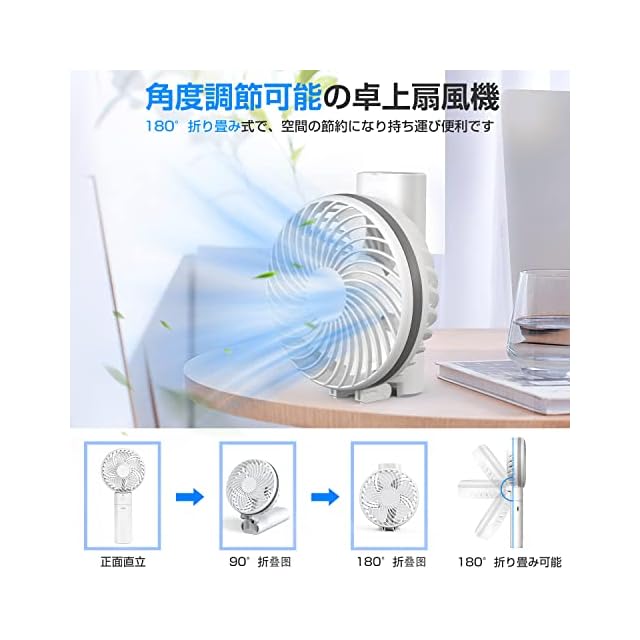 「180度折り畳み式&洗いやすい」180度折り畳んでご自由に角度を調整可能です。バッテリーはスタンド機能があって、より便利で安定に卓上に立ています。外出する時、折り畳んですぐにせんぷうき扇風機 ミニになりました。バッグまたはポケットの中に入れても負担はありません。空間の節約になり持ち運び便利です。また、フロントカバーを分解できるので、洗いはやすくなりました。常に扇風機を綺麗に保つことができます。