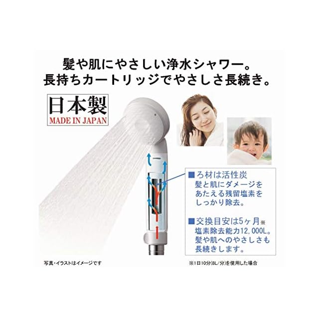30%の節水機能※1、長寿命カートリッジ※2、日本アトピー協会推薦品、浄水/原水をカンタン切替え、簡単取り付け、医師が勧めたい浄水シャワー、※については商品の説明(ページ下部)に記載