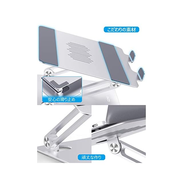 ●【滑り止めの面積が広い】:他社製品と比べ、ノートPCと接触する部分に広いシリコンゴムを使用しており、外装を傷つける心配もなく安心してご使用いただけます。さらに、滑り落ちを防止するストッパー部分や底面には4つのゴム足が付いており、スタンドの安定性を確保し、テーブルへの傷も効果的に防ぐことができます。 ●【熱くなりにくい仕様】:アルミの素材とスタンドの天板部分の通気口により通常よりも排熱が効率よく、夏などの熱がこもりやすい時期にも◎です。